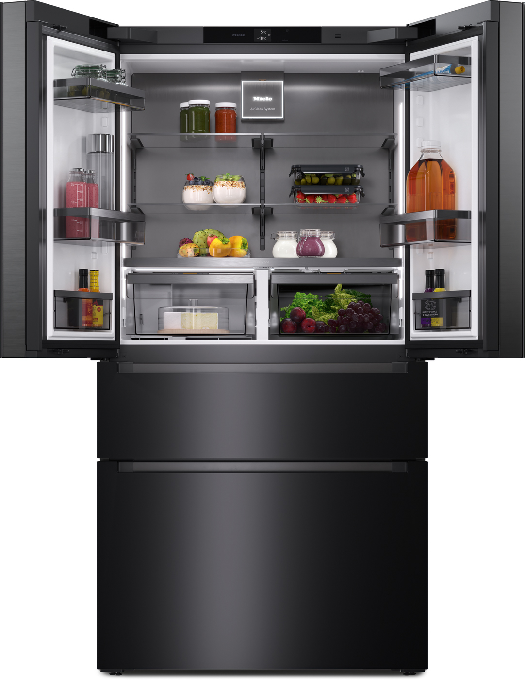 Mit den neuen French Door Standgeräten etabliert Miele eine Premium-Kategorie, die funktionale Vielfalt mit edler Optik vereint. Das Design mit Flügeltüren ermöglicht nicht nur einen komfortablen Zugriff auf alle Fächer, sondern bietet auch Raum für eine übersichtliche Lagerung. Besonders hervorzuheben ist das Frischesystem „PerfectFresh Active“, das mit aktiver Befeuchtung für längere Haltbarkeit sorgt. Ergänzt wird dies durch das „Longlife AirClean System“. Der regenerierbare Filter reduziert spürbar störende Gerüche und bewahrt damit die Frische Ihrer Lebensmittel. Ein weiteres Highlight der Geräte ist die „Freeze&Cool“- Funktion. Sie ermöglicht es, einen Teil des Gerätes flexibel als Kühl- oder Gefrierfach zu nutzen. Während der Eis- und Wasserspender für eine gefilterte Erfrischung sorgt, setzen die hochwertigen Glasoberflächen ein stilvolles Statement in jeder modernen Küche. Ideal für Familien, die Wert auf Design und Komfort legen.